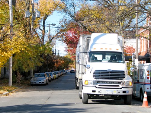 photo miscellanea » truck making delivery to the Van Dyck across from the Gillette House blocks westbound lane of Union St. – 2Nov2010