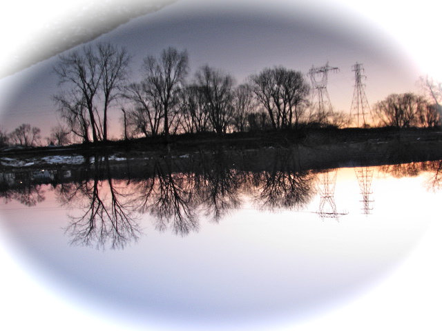This is last night’s sunset, snapped from the Washington Ave. deadend. I couldn’t resist flipping it, so that the river is on top and the sky on the bottom. Blame it on the Ides of March (discussed here at f/k/a, with a related haiga there, and some senryu/haiku here).