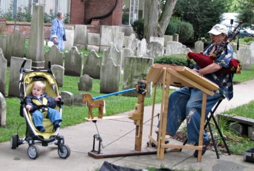 Outdoor Art Show 2009: a weather gamble pays off » Larry Meyerhoff plays Celtic music to a young fan next to St. George’s Episcopal Church – 12Sep09