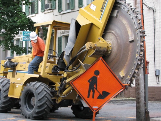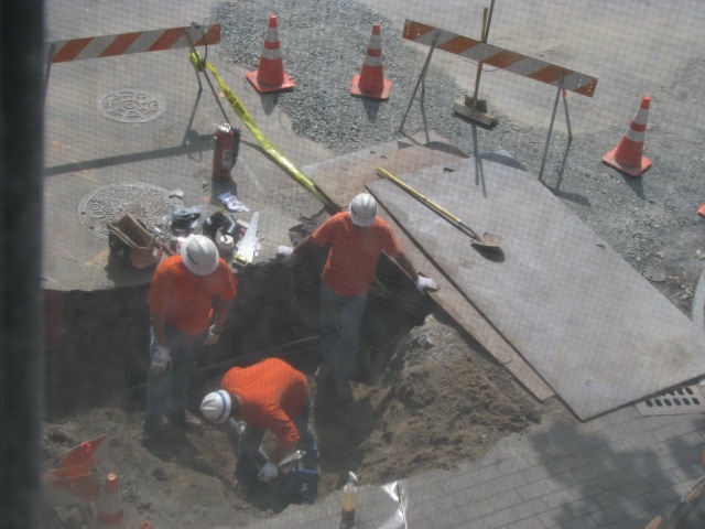 After a night of teeth clenching that I blamed on that damnable cricket, I sat at my desk with a big mug of coffee first thing this morning, planning to follow Frasier’s example by finding a gecko to end my cricket misery. All thoughts of cricket-hunting were immediately dispelled, however, when an intolerable racket began outside the window located just a couple feet from my desk (see the photo above). I immediately knew the source of the audio assault — the return to Washington Ave. of the utility crew we told you about in June and July, in “my NiMo sunset” and “a different orange glow.” More precisely, the return to the corner of Cucumber Alley and Washington Ave. — and thus directly under my bay window — of the gas-pipe-laying men and machines of National Grid.