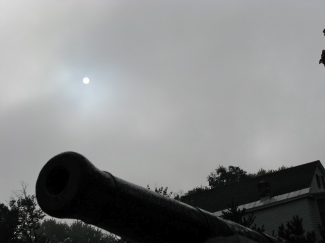 Mohawk mist on the last full day of summer » muted sun above the esplanade cannon as fog lists – Riverside Park, Schenectady Stockade – 21Sep09