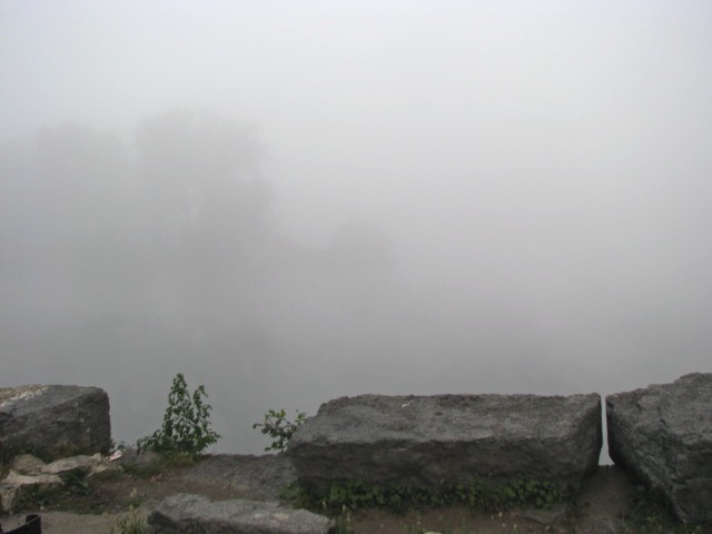 Mohawk mist on the last full day of summer » a view of the Isle of the Cayugas in the Mohawk River from the end of Washington Ave., Schenectady, on a foggy morning – 7 AM 21Sep09