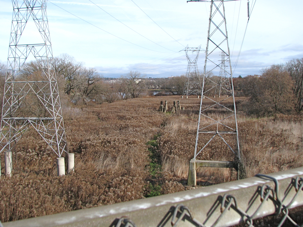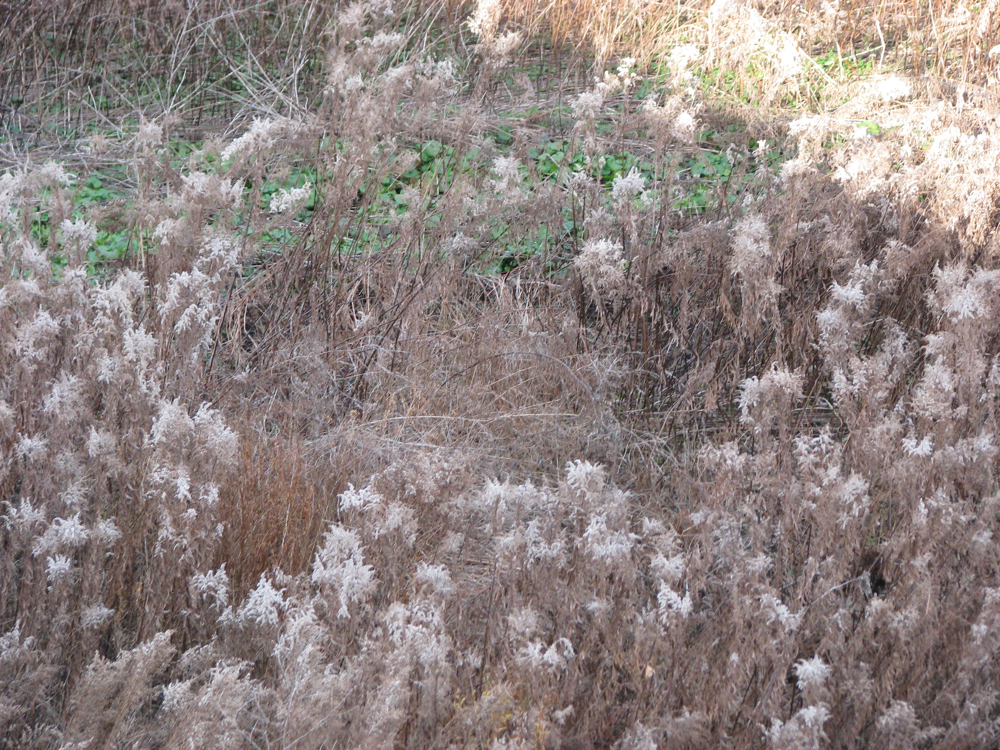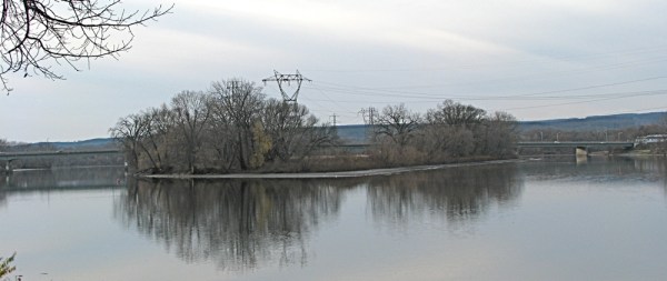 follow-up (9 AM, Nov. 20, 2009):  Loraine, our highly observant Commentor-friend, suggests that the mid-section of WGB is now visible because “the 6 to 8 feet tall grasses are dying and matted down giving the view of the middle section of the WGB.  If you look at the Isle from the bridge, you won’t see trees in the middle, but just the matted down tall grasses.”  She has a point: Here’s a mid-Isle view from mid-Brige: