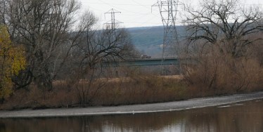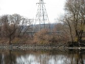 For the twenty years since I moved to Schenectady and its Stockade district, my view of the Western Gateway Bridge [“WGB”] has been from the east, in Riverside Park or my backyard on Washington Avenue in the Stockade.  For that entire time, I have seen only two segments of WGB from the Stockade — one on either side of the Isle of the Cayugas, which is situated under the Bridge.  The trees of the forested island block the view of the middle section of the bridge from the East.  For example, see the sunset photo at the top of this posting, which was taken only 6 weeks ago, on October 3, 2009.  In early November, however, I looked at WGB from near the kiddie playground of Riverside Park, and for the very first time also saw a middle section of the bridge.