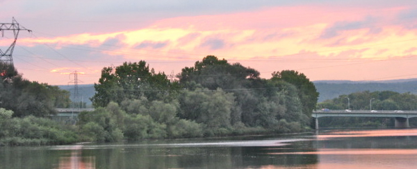 When I first spied that middle section, I was in Riverside Park with Sylvie Briber (and her dog Lollipop).  Sylvie, the long-time editor of the Stockade Spy, has frequented the Park for years.  Neither she nor I could remember ever seeing/noticing that third section of the Western Gateway Bridge before that evening.  However, when I breathlessly told another friend who lives along the Park about our amazing “discovery,” she insisted it’s been visible other years after the leaves fall, and that we simply have not been looking from the right angle or perspective — or not paying enough attention while enjoying sunsets beyond the Bridge.