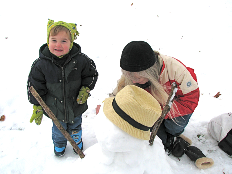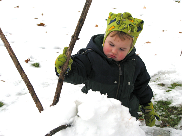 Finally, Devin proudly displaying his very first snowman: