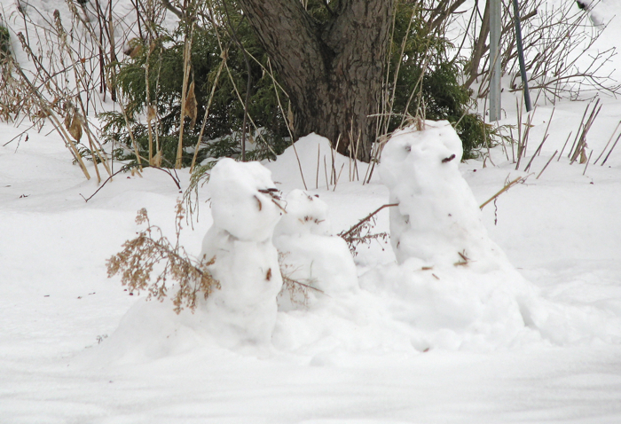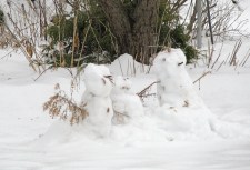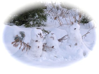 update (Dec. 13, 2009):  As you can see at the head of this update report, the three Petta snowpersons are doing fine three days after our first visit.  I can’t say the same for the snowman made by Devin, Loraine and myself on Thursday (see below).  He’s still standing on guard, but has lost a couple accessories. I bet he’ll soon be back to his original dapper self (as always, click on a photo for a larger version).