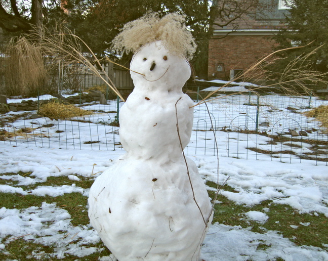 follow-up (Dec. 14, 2009):  Devin and Loraine headed out to do some touch-up on their snowman early this afternoon.  With the temperature around 40 degrees F., we found soggy snow on the ground and a shrunken, terminally ill snowman.  I don’t know if a cute snow-woman was to blame, but our guy had lost his head.  Here’s what we found this afternoon: