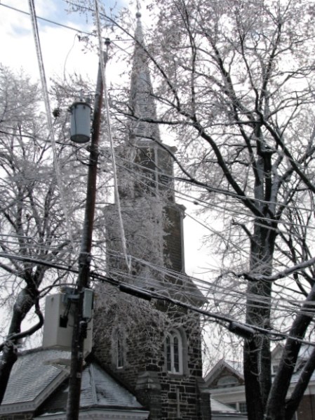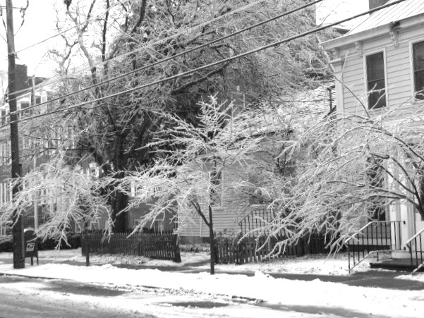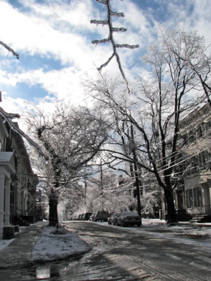 One year ago today, on Friday December 12, 2008, Stockadians and hundreds of thousands of people in the Capital Region of New York and across New England woke to find an ice storm that prevented travel and commuting and left whole communities without electrical power. This website did not exist at the time, but I was still writing daily commentary on law, politics, and culture — intermixed with haiku poetry — at my weblog f/k/a. In a posting there titled “ice storm interruptus” (Dec. 13, 2008), I wrote of my icy adventures and included a few photographs from the Stockade.