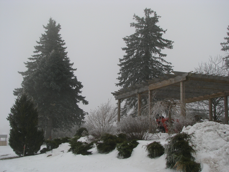 Former Stockade residents Bill and Cyndi Miner (they lived at 212 Union St. in the mid- ’80s and early ’90s, when I lived at 214 Union St., and we shared a driveway and a lot of good times) invited me to their spread along Rt. 20 in Duanesburg for a Christmas brunch. Approaching the Duanesburg hill, I was surprised to see a fairly thick fog, along with ice-frosted trees. The temperatures were mild enough to allow my camera’s shutter button to operate smoothly, so I left a cozy wood stove to try to capture a marvelous Christmas Day “backyard” scene in pixels. Despite the prominence of gray, white and black, each of the photos in this posting is presented in its original color scheme. (As always, you click on a photo to get a larger version and scroll over it for a brief description.)