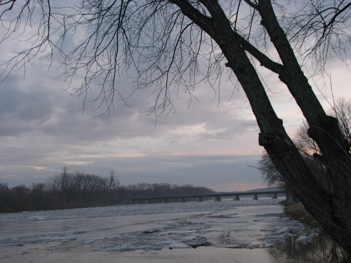 Near sunrise yesterday, I also photographed the confluence of both channels of the Mohawk, as they merged near the eastern tip of the Isle of the Cayugas, on their way to the ice-jam-prone CSX trestle bridge. Here are two of those shots: