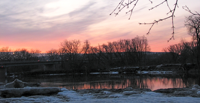 Wednesday evening, I saw sunset reflections on the Mohawk River for the first time in quite awhile, thanks to melted ice and a free-flowing stretch of river. The pictures in this posting were all taken from the rear of 1 Cucumber Alley. As you can see, the ice floes deposited by the January flood (documented by us here) are shrunken a bit but still very much in residence.