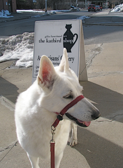 – Foxy strolled over from Front St. in the Stockade and was well-behaved inside and outside The Katbird Shop when she previewed the Show on Friday –