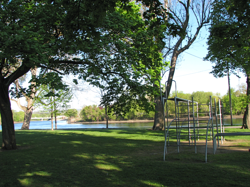 – and, here’s a view of the Play Area (with homes close behind it) from the riverbank at what would be the eastern end of the proposed dock: