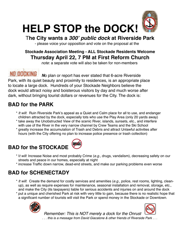 Why Oppose a Dock in Riverside Park? Hundreds of residents of the Stockade believe the dock would be Bad for the Park, Bad for the Historic District and Neighborhood, and Bad for the City of Schenectady. For a brief summary of my position, click this link (which brings you to a short statement near the bottom of this posting). A 5-page Letter to the NYS Canal Corp., dated April 29, 2010, contains a more comprehensive discussion.