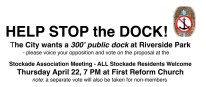 Riverside Park and its Stockade neighbors badly need your help and protection. Pease click Help Stop the Dock for my letter-size, printable, one-pagepdf. flyer, which opposes placing a 300′ public dock at Schenectady’s Riverside Park, on the banks of the Mohawk River. The flyer succinctly states the main reasons — beyond the City’s underhanded process — for opposition to the dock. You can also see the flyer by scrolling down this posting. It urges participation in the April 22 Stockade Association meeting, at 7 P.M., in First Reform Church parish center, 8 No. Church St. [Note: As stated in the update below, Stockade residents voted more than 2 to 1 against the proposed dock (85 to 41) at the April 22 meeting.]