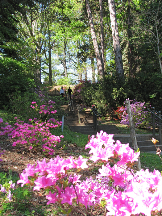 Nevertheless, my visit to Highland Park was far from a bust — because lilacs are not the only attraction at Highland Park. Before I ever saw my first lilac, I drove past the stairway shown in the photo above and immediately stopped to take a closer look at the beautiful scene. Azaleas and rhododendrons more than made up for the minor lilac disappointment as I rode and walked through Highland Park on a day with bright blue skies and postcard clouds. Here are a few photos to show you why: