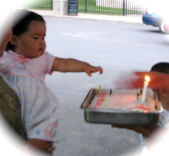 riverside picnic with the kids (with birthday update) » Xiwen points at her first birthday cake in Riverside Park – 28July2010