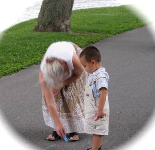 riverside picnic with the kids (with birthday update) » Hainua watches while a hopscotch court is drawn in chalk at Riverside Park at his sister’s 1st birthday party – 28July2010