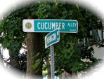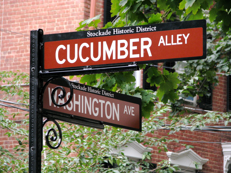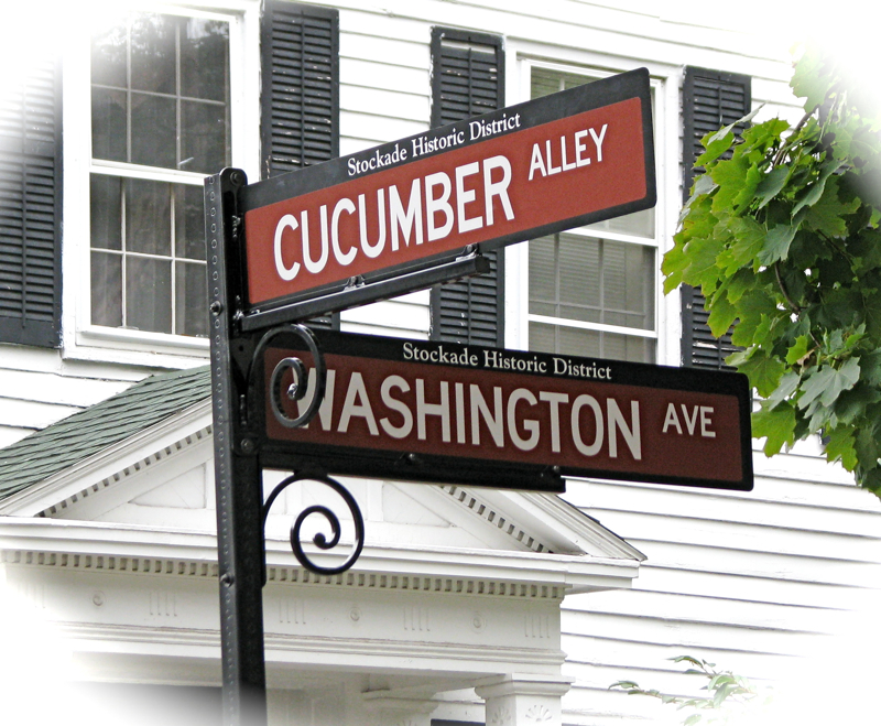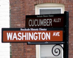 Well, it finally happened today. Heading up the Alley from my front porch this afternoon, I saw a most welcome sight: the Stockade Historic District street signs, bracket and pole for Cucumber Alley and Washington Ave.