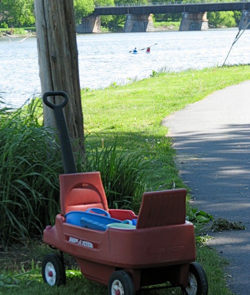 potential environmental effects of the Riverside Park dock » wagon on planting day in Riverside Park with kayakers on the Mohawk near the end of Governor’s Lane – 15May2010