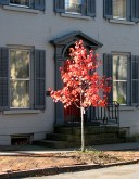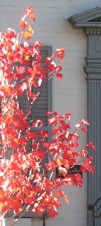 She caught my attention from a block away. Mid-morning on each of the recent run of sunny days, I spotted a small, flaming-red tree down the block on the south side of Front St., near Governor’s Lane and west of N. Church Street. Each day, I paused a moment to marvel at the sight, but was heading in the other direction and got no closer. When I did walk or drive past the tree over the long weekend, the sun was no longer illuminating it and I (being superficial) paid her no attention — not even noticing that it stood in front of 10 Front Street.