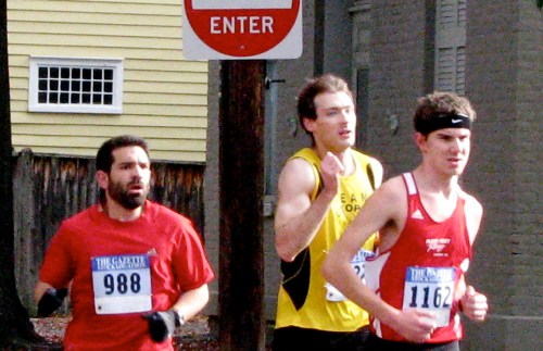 Stockade-athon 2010 visits Lawrence » Runners #988, #1162 [Alex Paley of Albany, who finished the race in 10th place] & #1227 entering the Lawrence Circle – Stockade-athon 2010 – 07Nov2010