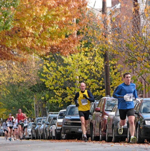 Stockade-athon 2010 visits Lawrence » Runners #1272 & #1141 on Front St. in the Schenectady NY Stockade approaching the Lawrence Circle – Stockade-athon 2010 – 07Nov2010