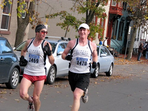 Stockade-athon 2010 visits Lawrence » Runners #1469 & #1470 of the Albany Running Exchange head west on Front St. after passing through the Lawrence Circle – Stockade-athon 2010 – 07Nov2010