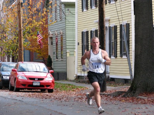 Stockade-athon 2010 visits Lawrence » runner #14 on Front St. heading west approaches Lawrence Circle in the Schenectady Stockade – Stockade-athon 2010 – 07Nov2010
