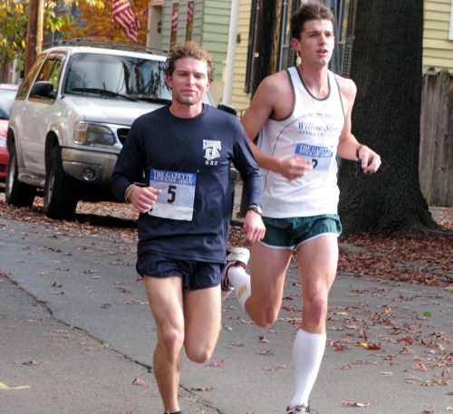 Stockade-athon 2010 visits Lawrence » Runners #5 [Andy Allstadt of Albany, who later won the race] and #2 [Tim Chichester of Mount Morris, who finished the race in 2nd place] are the first to reach the Lawrence Circle – Stockade-athon 2010 – 07Nov2010