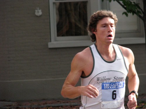 Stockade-athon 2010 visits Lawrence » Runner #6 [Scott Mindel of Ballston Lake, who finished in 3rd place] enters the Lawrence Circle – Stockade-athon 2010 – 07Nov2010