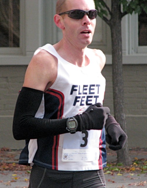 Stockade-athon 2010 visits Lawrence » Runner #3 [Mark Andrews of Rochester, who finished the race in 5th place] reaches the Lawrence Circle – Stockade-athon 2010 – 07Nov2010