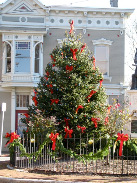 As you can see in this slideshow, the tree is stately and shapely with its red bows and lights, and is photogenic from any angle.