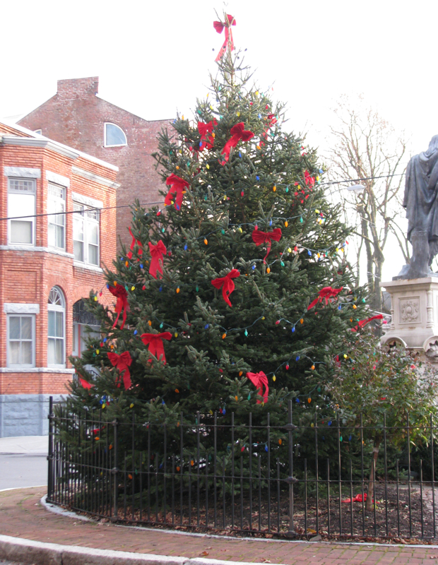 The beautiful evergreen that will serve as the 2010 Stockade holiday (f/k/a Christmas) tree arrived last Monday and was erected and decorated next to the statue of Lawrence the Indian. The tree was donated by Jack McDonald.