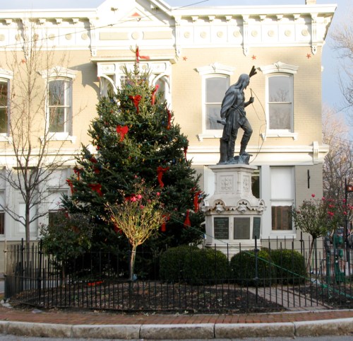 the 2010 Stockade Holiday Tree » western view of Lawrence the Indian and the 2010 Stockade Tree in the Lawrence Circle – Schenectady NY – 03Dec2010