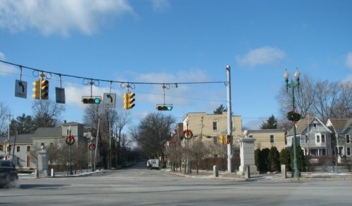 the Stockade gateway streetscape seen from a vehicle under the trestle at Erie Blvd. and Union St.