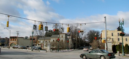 entryway to the Stockade as seen from the NE corner of Erie Blvd. and Union St. with Clinton’s Ditch Bar on the left and Gillette House in the middle