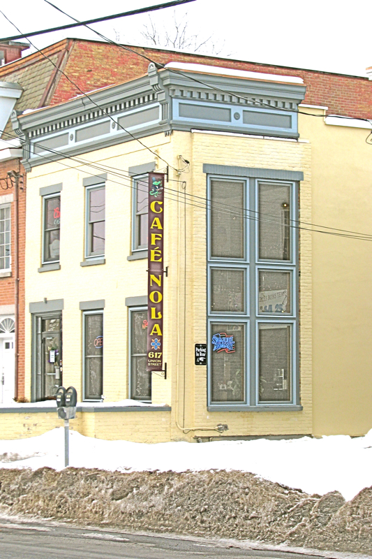 The Historic District Commission recently allowed Cafe Nola to carve up the side of 617 Union St., part of the Union Street Corridor Historic District, with a giant window display (see above, and click on the photo for a larger version). Followup: Cafe Nola, despite its giant, nonhistoric, commercialized window, closed in December 2016, due to a failure to pay its taxes.