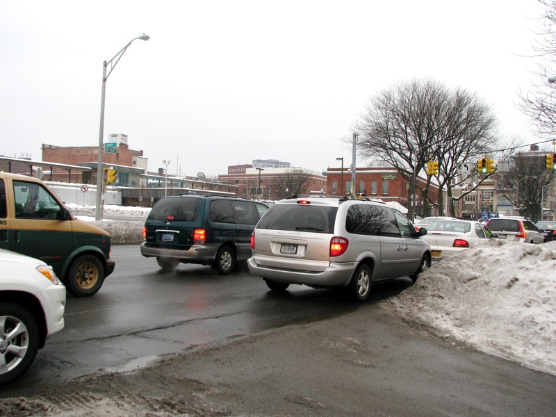 The funneling of vehicles for parking purposes onto a narrow (less than 20′) one-lane, one-way, one-block street (So. College), with only one exit, that merges precariously into Erie Blvd., a major rush-hour artery (see Street Map and Photo), a couple yards from So. Liberty St. There are no traffic devices or signs at the exit of So. College St., other than a Yield sign, leaving vehicles exiting So. College with no more protection than they would have coming out of a private driveway onto a very business highway and intersection. Left turns are already virtually impossible at busy times and right turns often take long waits and a risk-seeking personality. And,- An increase in U-turns (or K-turns, or driveway turns) on Union St. to allow customers parking on the street to return to Erie Blvd. after a stop for bagels