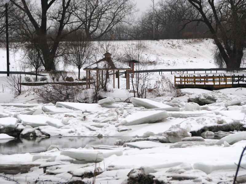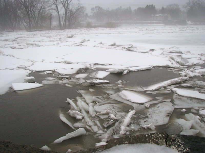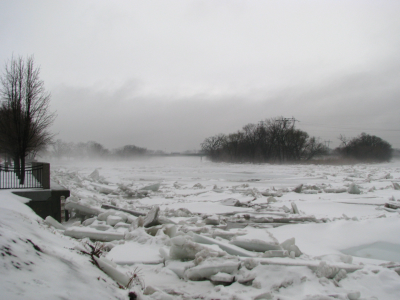 – ice jams and fog at Riverside Park (7 AM Friday March 11) –