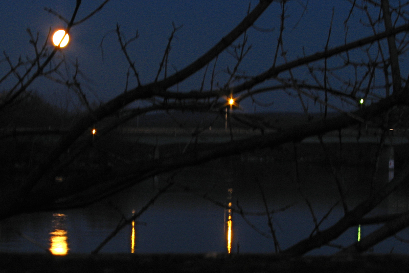 Despite a woefully shaky practice shoot the evening before, I recklessly went out last night without a tripod to take pictures of the so-called Super Full Moon* in the eastern sky, and then again this morning as it was setting in the west. Clouds, plus bad timing and angles, provided even more frustrations. The result was a batch of photos with mostly egg-shaped, double, blurry or unidentifiable full moons. Nonetheless, I did get relatively lucky a few times and the results are shown below.