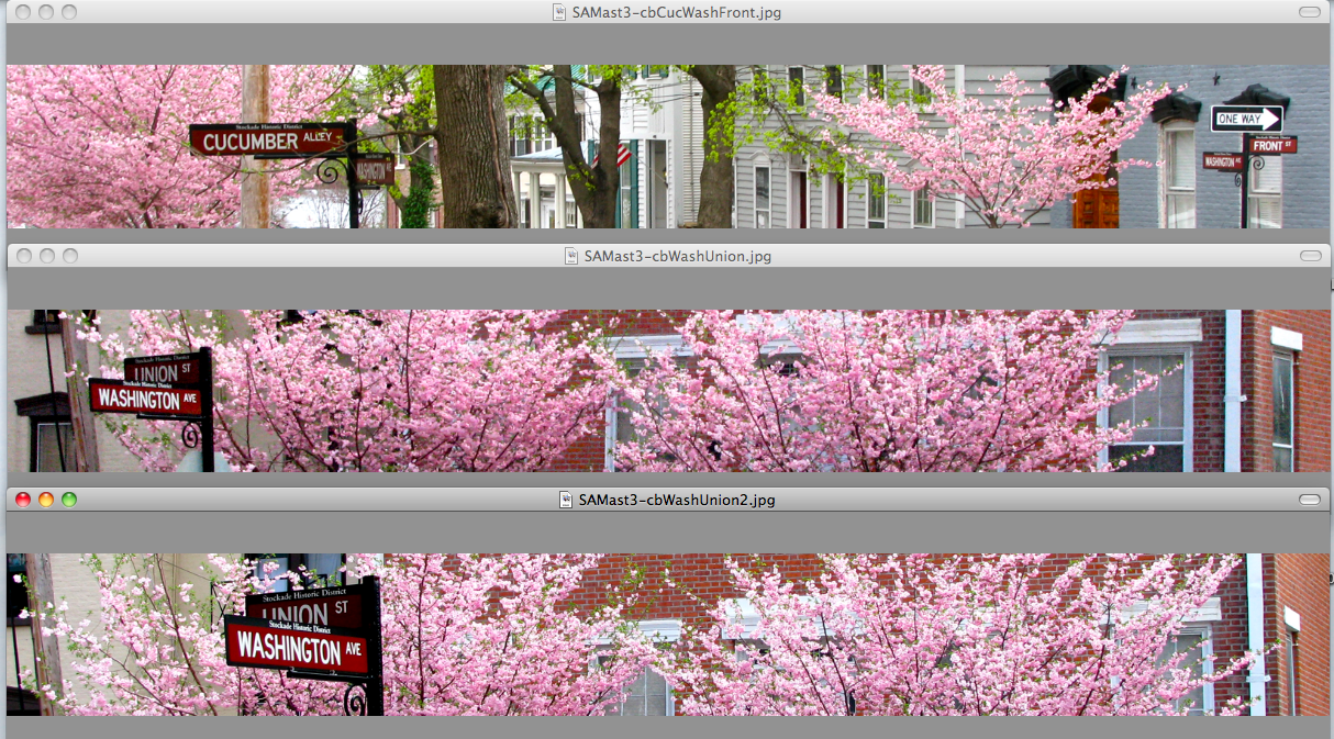 This season’s blossoms lived up to their symbolic message about beauty and impermanence. They may, however, soon be memorialized on the masthead of the Stockade Association website — as part of a series of photographs in rotation. Until then, here are screen-shot samples of images of our 2011 blossoms along Washington Avenue, sized in the challenging 8.5 to 1 aspect ratio of the Association masthead. You can click on either sampler for a larger version.