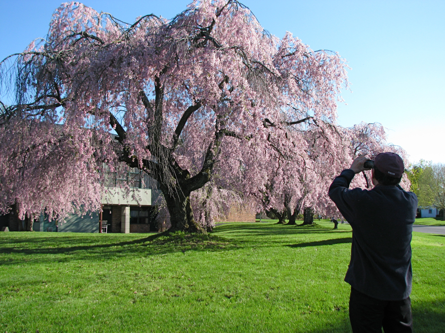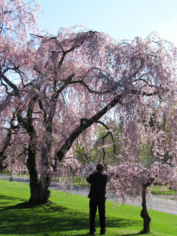 This year’s CGOH cherry blossom crop was fading but still glorious when I stopped by last Saturday and took advantage of the bright late-afternoon sunshine. It was a special treat for someone who loves both cherry blossoms and gnarled tree limbs. I walked over there with my friend Yu Chang, who lives near Central Park. Yu, a Union College engineering professor and much-honored haiku poet, started my photography hobby three years ago when he gave me a fine hand-me-down digital camera.