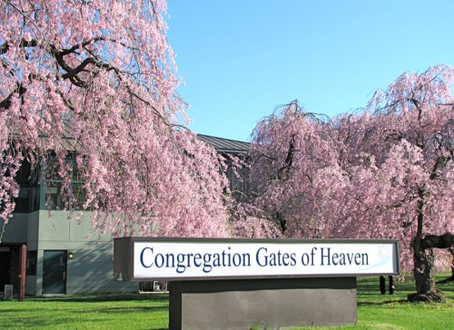 peaceful cherry blossoms » nameplace sign and cherry blossoms on the grounds of Congregation Gates of Heaven in Schenectady NY – 30April2011