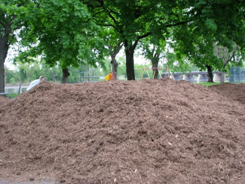 Riverside playground gets mulched for safety » mound of mulch to be used for ground cover at Riverside Park playground – Schenectady Stockade – 14May2011e
