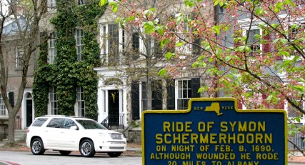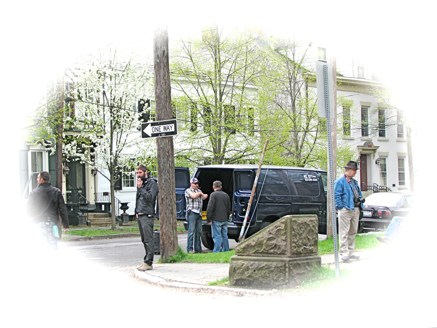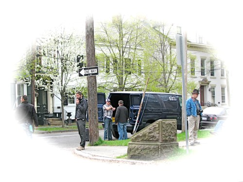 A white Acadia Denalia was parked in front of 17 Front St. and was the focus of the crew’s filming after the action scene on Front Street was completed. As suggested at the top of this post, I bet Symon Schermerhoorn would have loved to take the Acadia for his 20-mile ride to Albany in 1690 warning of the French and Indian attack. Naturally, Mrs. S. would have warned her wounded husband not to bleed on the leather seats.
