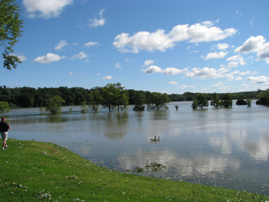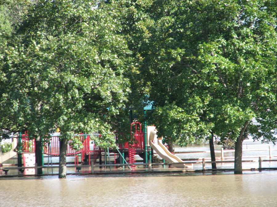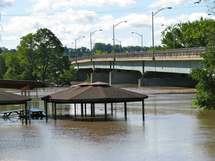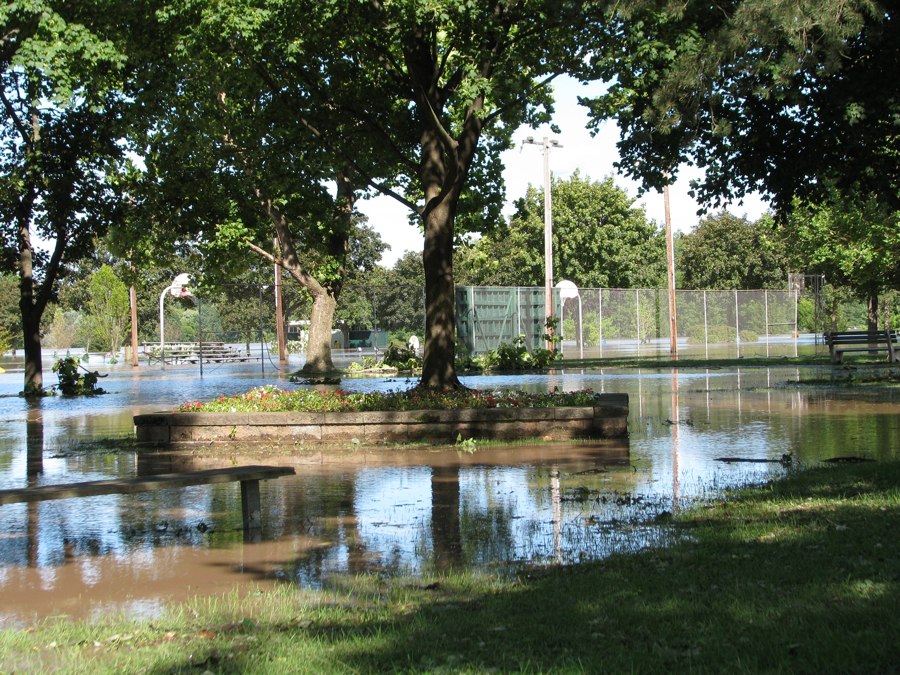 update (Labor Day, Sept. 5, 2011): See “a gray Labor Day after Irene” for follow-up photos. E.g., the geese have Collins Park to themselves this Labor Day, due to the problems Irene left behind: