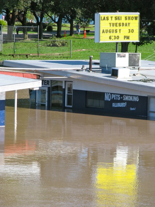 Jumpin’ Jack’s sign touts last water ski show [cancelled]