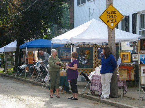 showing off artfully in the Stockade » several artists chat an hour before the Show starts – 60th Annual Stockade Villagers’ Outdoor Art Show – Schenectady NY – 10Sep2011